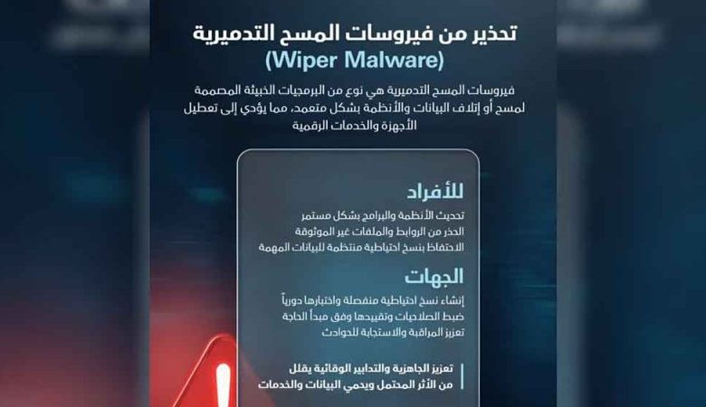 أهاب مجلس الأمن السيبراني في دولة الإمارات العربية المتحدة، بجميع الآفراد والجهات إلى توخي الحذر من فيروسات المسح التدميرية (Wiper Malware)، وهي من أخطر البرمجيات الخبيثة المصممة لمسح البيانات وتعطيل الأنظمة بشكل متعمد.