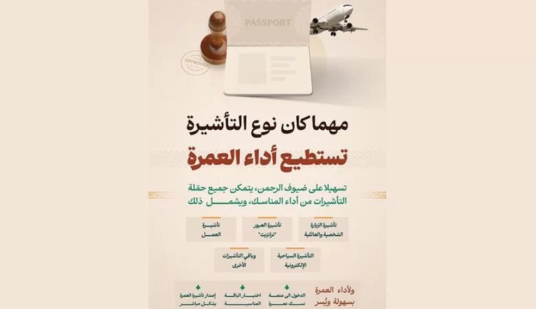 أكدت وزارة الحج والعمرة السعودية اليوم الأحد أن جميع حاملي التأشيرات بمختلف أنواعها يمكنهم أداء مناسك العمرة خلال وجودهم في المملكة.وأوضحت الوزارة في بيان أوردته وكالة الأنباء السعودية أن هذه التأشيرات تشمل تأشيرة الزيارة الشخصية والعائلية وتأشيرة السياحة الإلكترونية وتأشيرة العبور (الترانزيت) وتأشيرة العمل وبقية أنواع التأشيرات الأخرى.وأضافت أن هذه الخطوة تأتي امتدادا لنهج المملكة في تسهيل قدوم المسلمين من مختلف أنحاء العالم لأداء الشعائر بكل يسر وطمأنينة.