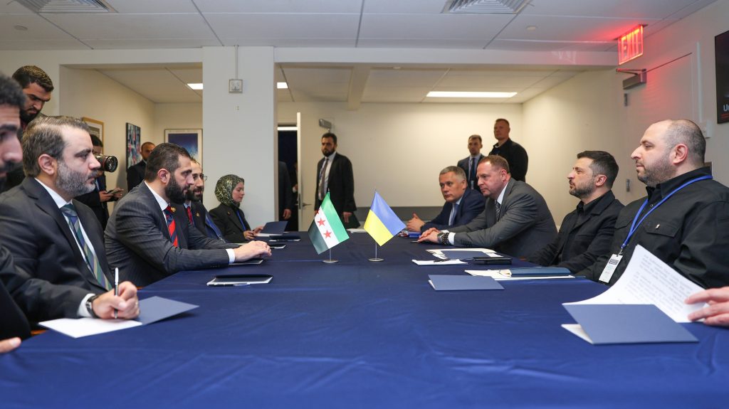 وقعت سوريا وأوكرانيا بيانا مشتركا لاستعادة العلاقات الدبلوماسية، وذلك خلال لقاء جمع الرئيس السوري أحمد الشرع مع الرئيس الأوكراني فولوديمير زيلينسكي، على هامش أعمال الدورة الثمانين للجمعية العامة للأمم المتحدة في نيويورك.