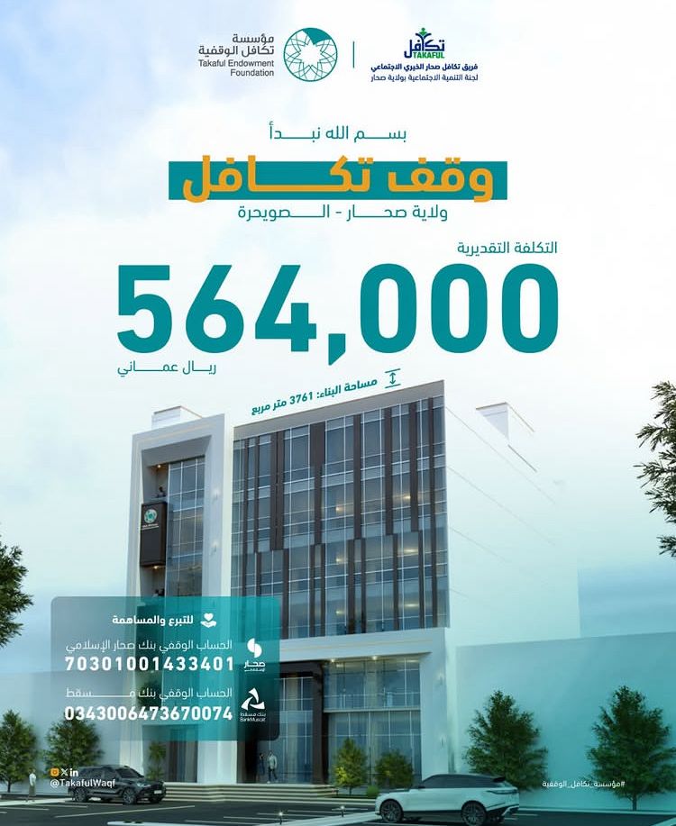أعلن فريق “أوج التطوعي” التابع للشبكة العُمانية للمتطوعين “تعاون”، عن شراكة استراتيجية مع شركة ميناء صحار والمنطقة الحرة ، بالتعاون مع فريق تكافل صحار الخيري الاجتماعي ، لإطلاق مشروع “وقف تكافل” الذي يُعد من المشاريع الوقفية الواعدة الجاري تنفيذها في محافظة شمال الباطنة.
