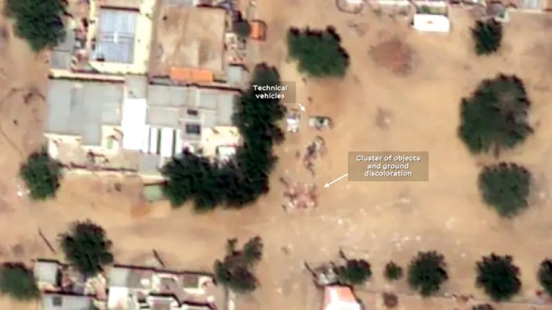 وأظهر تحليل صور الأقمار الصناعية أجساماً على الأرض بحجم يماثل حجم الأجساد البشرية بالقرب من مركبات الدعم السريع، إلى جانب ما لا يقل عن خمس بقع من التربة المحمرة.