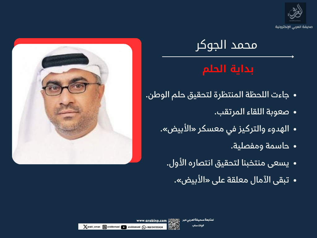 المواجهة المرتقبة، اليوم، ضمن الجولة الثانية من الملحق الآسيوي المؤهل إلى نهائيات كأس العالم 2026 على ملعب جاسم بن حمد في الدوحة، تُعد حاسمة ومفصلية، إذ يسعى منتخبنا لتحقيق انتصاره الأول بعد فترة طويلة من التحضيرات المكثفة، فيما يأمل المنتخب العماني في تثبيت بدايته الجيدة وتعزيز حظوظه في المنافسة على بطاقة التأهل. وبانتظار ما ستسفر عنه المواجهة التي من المتوقع أن تلعب دوراً محورياً في رسم ملامح الطريق نحو مونديال 2026، تبقى الآمال معلقة على «الأبيض» لبدء تحقيق حلمنا الكبير.. والله من وراء القصد