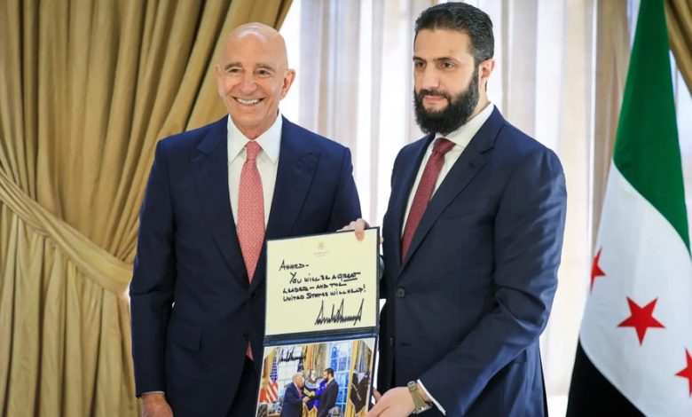 سلم المبعوث الأميركي الخاص إلى سوريا توم براك رسالة خطية من الرئيس الأميركي دونالد ترامب إلى الرئيس السوري أحمد الشرع.