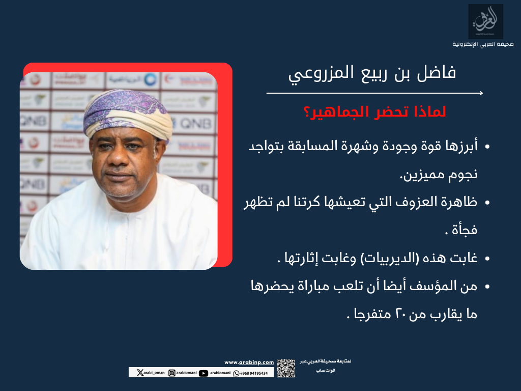 ظاهرة العزوف التي تعيشها كرتنا لم تظهر فجأة ،بل جاءت بالتدرج بعد أن فقد الشغف في دورينا الذي تراجع مستواه وغاب عنه النجوم وأفتقد إلى صفقات اللاعبين الأجانب الكبيرة ، مقارنة أيضا عما كان عليه في نهاية الثمانينيات وبداية التسعينيات،عندما سجل الدوري العماني صفقات ملفتة ، فقد تواجد أكثر من لاعب عربي كبير أمثال المغربيان التيمومي وعبدالرزاق خيري في نادي السويق ، وطاهر أبو زيد في صحار وشوقي غريب في ظفار والسوري الناصر في العروبة والتونسي الصنهاجي في النصر والسوداني عمر العلمين في السيب ،وعدد من اللاعبين الأفارقة في فنجاء ونادي عمان ولاعبين برازيليين في الأهلي .