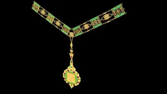 تُصنع القلادة من الذهب الخالص أو الفضة المذهّبة ويعكس تصميمها التراث المصري القديم.