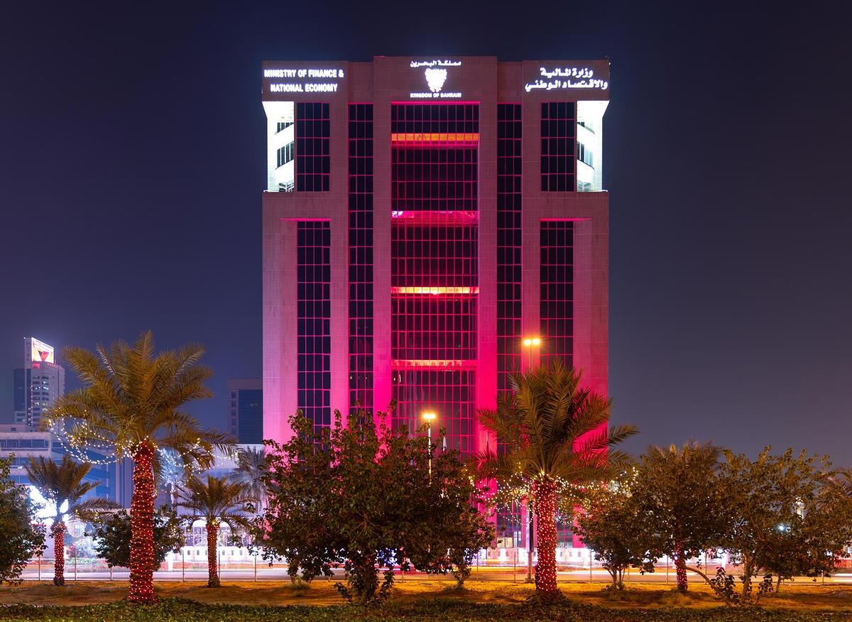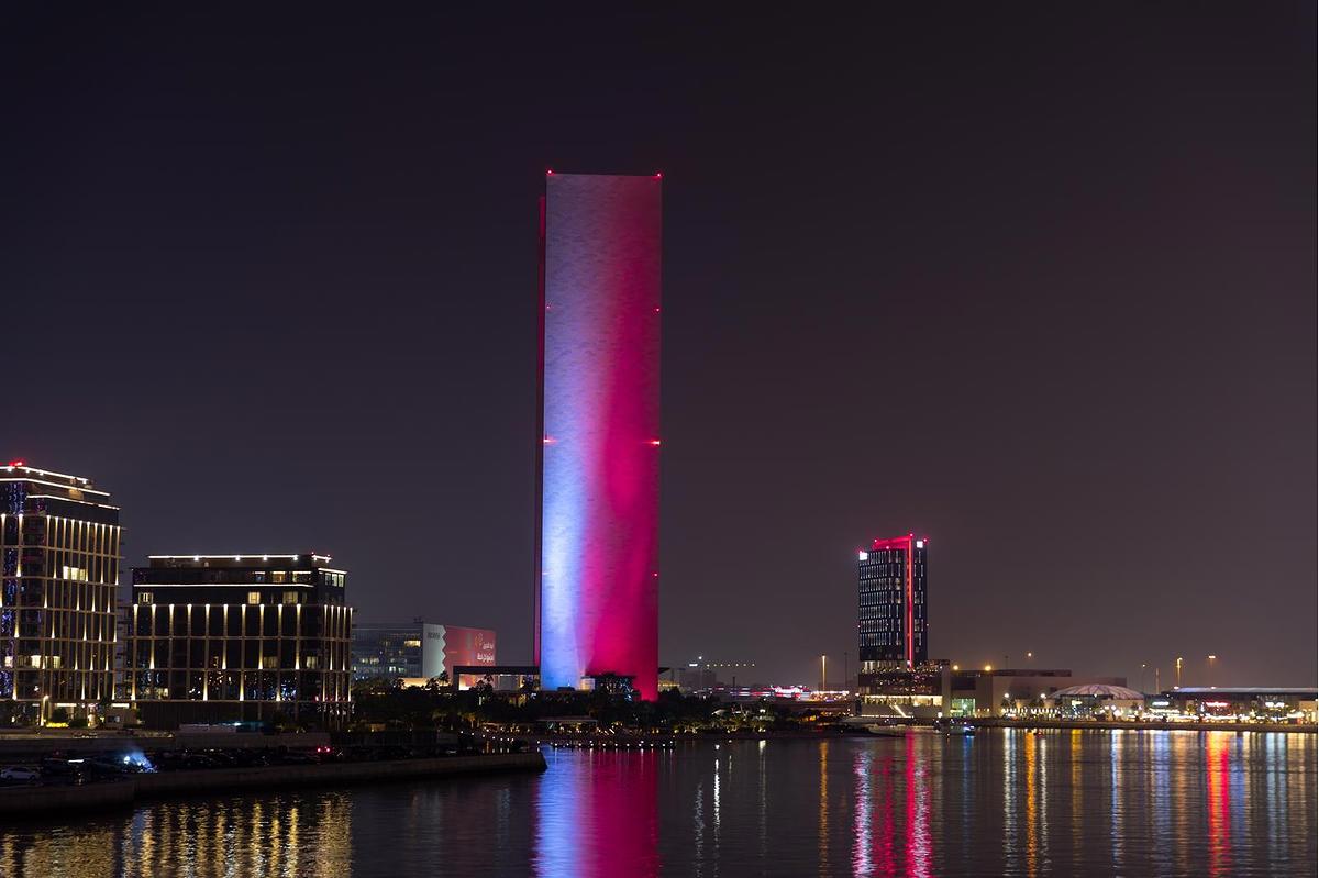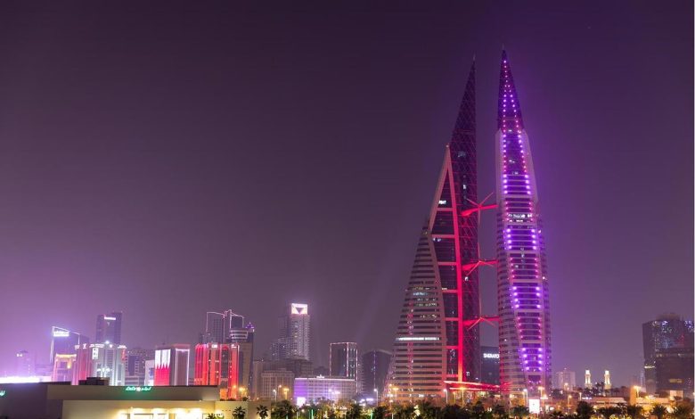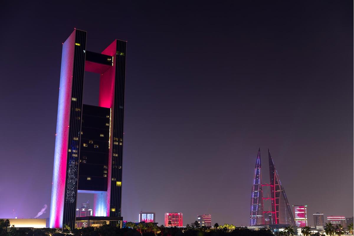 مباني العاصمة المنامة تتشح باللونين العنابي والأبيض احتفاءً بالعيد الوطني لدولة قطر
