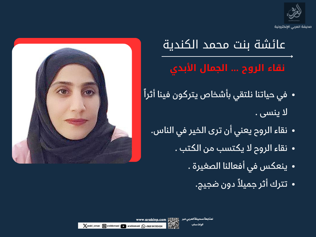 نقاء الروح لا يكتسب من الكتب أو التجارب وحدها بل من التربية الصادقة والإيمان العميق بأن الخيريعود إلى صاحبه مهما تأخر، و أجمل ما في نقاء الروح أنه لا يتأثر بملامحنا أو مكانتنا بل ينعكس في أفعالنا الصغيرة في احترامنا للأخرين وفي قدرتنا على نشر السلام في محيطنا أما بالنسبة لجمال الخارجي قد يبهرك لحظة ولكن جمال الروح يسكن القلب ويترك بصمة إيجابية في المجتمع يصعب محوها . لنجعل من نقاء أرواحنا مرآه لقلوبنا ولنكن كالنسمة التي تمر برفق وتترك أثر جميلاً دون ضجيج وكالشمس التي تنير الطريق لمن حولها فلنجعل من كل يوم فرصة لتعزيزهذا النقاء ولنحرص دائماً على أن نحيا حياة تملؤها الرحمة والصفاء لأن في ذلك تكمن السعادة الحقيقية ومن هنا ينبع المعنى الأعمق لوجود الإنسان.