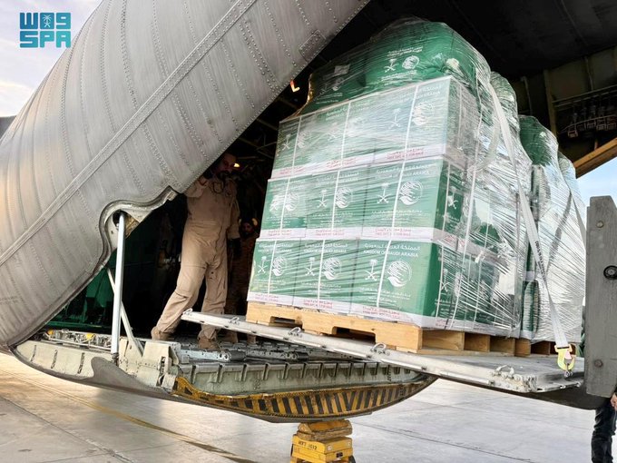 وتحمل الطائرة السعودية الـ(78) على متنها سلالًا غذائية وحقائب إيوائية، تمهيدًا لنقلها إلى المتضررين من الشعب الفلسطيني الشقيق داخل قطاع غزة.